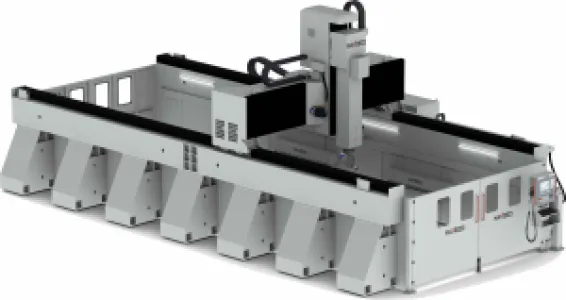 The Piranha features powerful spindles and can operate using either the FlexiCAM Advanced Control System (ACS) or an industry-standard Siemens or Fanuc control system. It is particularly effective in processing large parts that require extended axis travels, a long stroke, and considerable height under the gantry.
